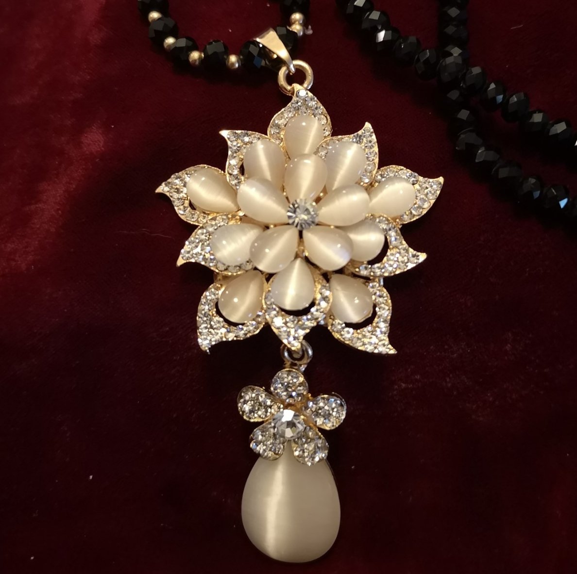قلادة طويلة من حجر عين القط الأبيض والعقيق الأسود